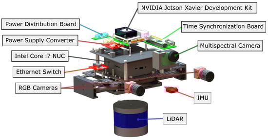 The sensing payload was designed for easy mounting on any aerial platform and can be tilted at different viewpoints ranging from horizon to nadir. Furthermore, the components are mounted in a modular way, allowing easy integration and removal of each one, if necessary, for operational constraints (e.g., limited weight capacity). In order to minimize weight, the sensing payload is configured to be powered using the UAV’s batteries. Hence, a power distribution board was used to distribute the appropriate voltages to each component.