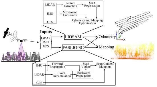 General scheme of the implemented localization and mapping approaches. Note that LIOSAM and FASTLIO-SC outputs are odometry and a 3D map in the form of a point cloud.