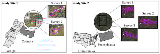 The study sites are located in Coimbra, Portugal, and Pittsburgh, United States. The magenta line depicts the path followed by the UAV. It is important to highlight that the UAV was operated remotely by a human expert during the aerial surveys conducted at the Coimbra study site. In contrast, for the Pittsburgh study site, the UAV flights were carried out using the UAV autopilot system.