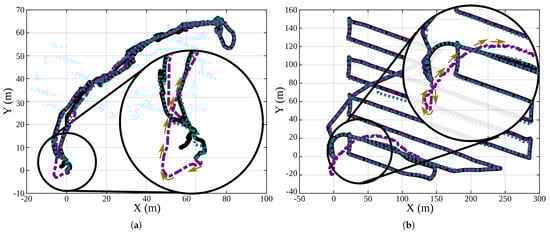 Qualitative odometry results of LIOSAM and FASTLIO−SC approaches. To avoid figure over−stacking, two representative cases of the study sites are shown. (a,b) shows the odometry of Survey 2 for the semi-urban area and Survey 2 for the rural area, respectively. The black solid line represents the RTK measurements, the cyan dotted line is the LIOSAM odometry, and the magenta dashed line depicts the FASTLIO−SC odometry. Yellow arrows depict the odometry direction estimated by FASTLIO−SC.