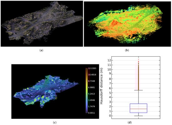 Point cloud maps of the (a) photogrammetry baseline, (b) SLAM outcome. The two maps were compared using the Hausdorff distance, whose result is visualized as (c) the SLAM map colored according to this metric and (d) a boxplot showing the error distribution. Note that the baseline and the SLAM clouds colormaps correspond to RGB and height values, respectively.