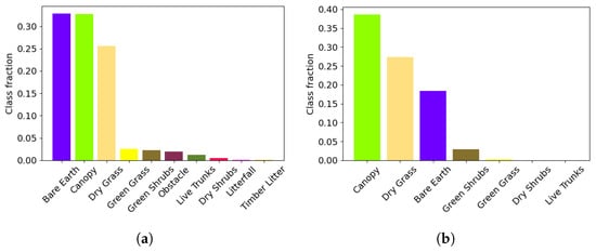 This shows the fraction of pixels per class for (a) the train set and (b) the test set. Note that the three dominant classes Canopy, Bare Earth, and Dry Grass are common across both collections but the comparative frequencies are somewhat different. These correspond to our aggregate Vegetation, Background, and Fuel classes, respectively. The fractions of other classes are fairly small, and some from the training set are entirely absent in the test set.