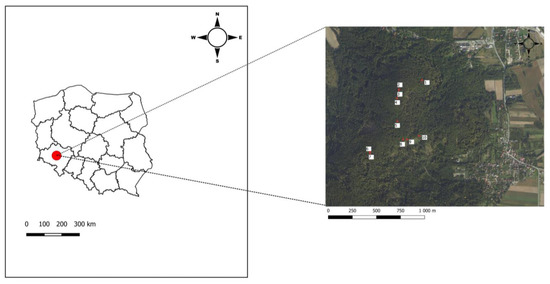 According to the physic-geographical division of Poland [30], the Ślęża Massif belongs to the province of the Bohemian Massif, a subprovince of the Sudetes and Sudeten Foreland, and is the highest elevation of the Sudeten Foreland. The massif is located in the Ślężanski Landscape Park. The highest elevation of the massif is Ślęża (50°51′54″ N, 16°42′31″ E) which reaches 718 m above sea level, and its relative height is about 500 m [31,32]. Most of the Ślęża Massif is composed of alkaline and ultramafic rocks. [31,32,33,34]. The forest cover of the massif area is 84%, 20% of which is coniferous forests dominated by spruce (Picea sp.), 23% by deciduous forests with a high proportion of oak (Quercus sp.) and beech (Fagus sp.), and 41% by mixed forests. The remaining 16% comprises agricultural habitats.