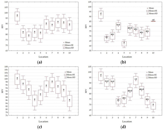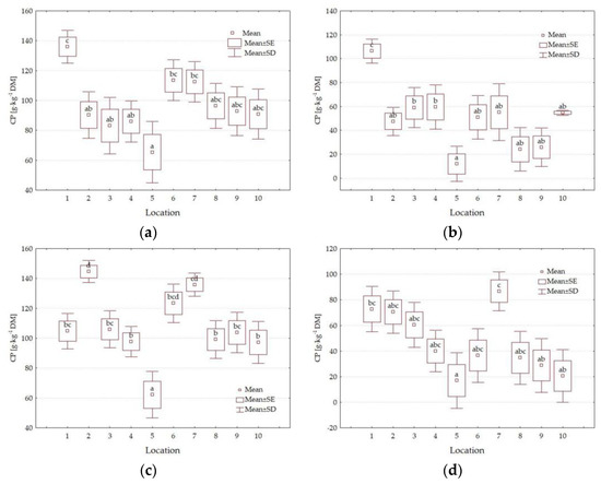 CP–crude protein content in Melica uniflora plants depending on the interaction of the location and term of harvesting (a) on the 1st date in 2021, (b) on the 2nd date in 2021, (c) on the 1st date in 2022, (d) on the 2nd date in 2022. Means with the same letter do not differ significantly at p < 0.05 in Tukey’s HSD test.