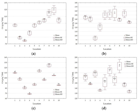 In the first year of the study, the content of CA in plants on subsequent dates was: on the first date, from 74.6 to 119.3 g·kg−1 DM; and on the second, from 93.9 to 154.2 g·kg−1 DM. Indeed, the highest amount of this component was recorded in plants collected at site No. 9 on the first date and in plants from sites No. 5, 6, 7, and 8 on the second date of the harvest. The lowest CA concentration on both dates was recorded in plants from site No. 3 (Figure 4a,b). In the second year, CA content on the first date of plant collection ranged from 68.9 to 124.5 g·kg−1 DM. On the second date, it was significantly higher, ranging from 133.4 to 183.0 g·kg−1 DM. On both harvest dates, the significantly highest CA content was detected in plants growing at site No. 8. On the first harvest date, the significantly lowest content of this component was recorded in plants from site No. 4, and on the second date, in plants harvested from sites No. 4 and 10 (Figure 4c,d).