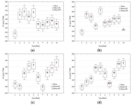 In the first year of the study, the CL content varied—from 315.7 to 366.1 g·kg−1 DM in July and from 336.4 to 423.1 g·kg−1 DM in October. The significantly highest CL concentration was recorded in plants harvested from site No. 5. On both test dates, the lowest CL content was observed in plants from site No. 1 (Figure 5a,b). In the second year, the CL content ranged from 298.2 to 335.7 g·kg−1 DM in July and from 317.8 to 389.8 g·kg−1 in October (Figure 5c,d). On average, the highest content of this component was found in plants growing at site 10. The significantly lowest content of this component, as in the previous year, was found in Melica uniflora plants growing in site No. 1 on both dates.