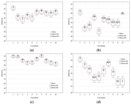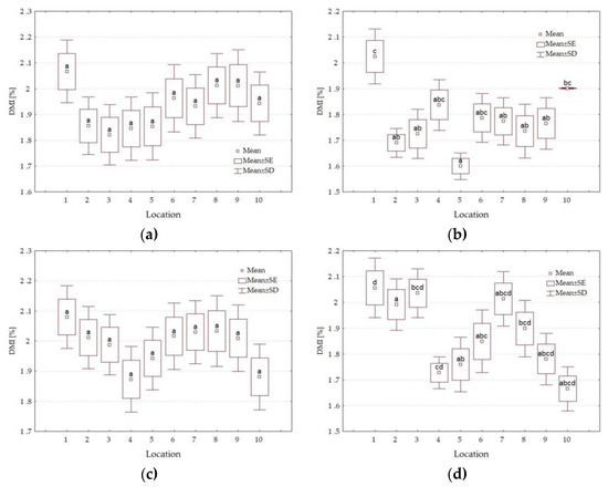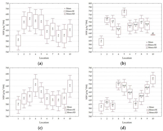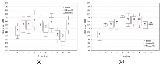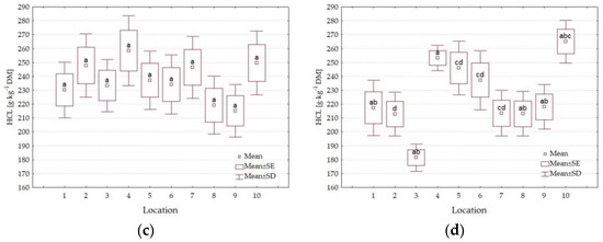 In the first year of the study, HCL content ranged from 198.8 to 240.8 g·kg−1 DM on the first date and from 203.0 to 252.2 g·kg−1 DM on the second date (Figure 6a,b). In the second year, it varied from 215.2 to 258.5 DM g·kg−1 on the first date and from 181.5 to 265.0 g·kg−1 DM on the second date. In 2021, the highest content was significantly characterized by plants from site No. 5, while the lowest was from site No. 1. In the following year, plants from site No. 10 contained significantly the most HCL and the least from site No. 3 (Figure 6c,d).