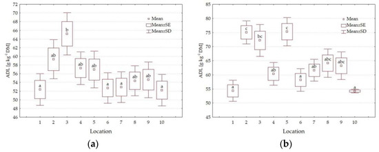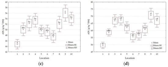 In the first year of the study, ADL content in plants ranged from 52.3 to 65.2 g·kg−1 DM on the first date and from 54.2 to 75.3 g·kg−1 DM on the second date of plant harvest. On the 1st date of harvest, significantly the highest content of this component was recorded in plants harvested from site 3, and the lowest from sites 1, 6, 7, and 10 (Figure 7a,b). In the second year of the study, the ADL content of the plants ranged from 44.8 to 56.0 g·kg−1 DM and 49.5 to 70.7 g·kg−1 DM on the first and 2nd dates of harvest, respectively. In that year (2022), on the first and second dates of the harvest, significantly the highest content of this component was recorded in plants harvested from site 9, and the lowest from site 1 (Figure 7a,b).
