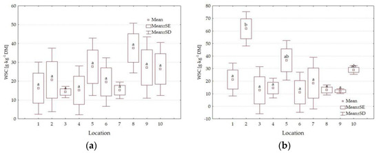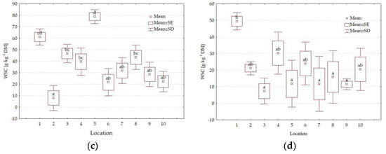 In the first year, in plants harvested on the first date, WSC contents ranged from 14.3 (site No. 3) to 37.6 g·kg−1 DM (site No. 8) and did not differ significantly between sites. In the second term, the content of WSC ranged from 11.1 to 61.8 g·kg−1 DM. The highest content was found in plants growing at site No. 2, and the lowest at sites No. 1, 3, 4, 6, 7, 8, and 9 (Figure 8a,b). In the second year of the study, on the first date of harvest, the content of WSC varied between plants collected from different sites and ranged from 8.0 (site No. 2) to 78.8 g·kg−1 DM (site No. 5). On the second date, WSC content ranged from 7.4 to 49.5 g·kg−1 DM. The highest WSC content was recorded in plants growing at site No. 1 and the lowest at sites 3, 5, 7, 8, and 9 (Figure 8c,d).