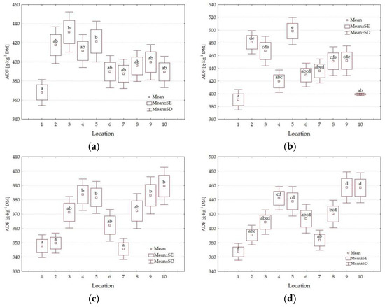 ADL–acid detergent lignin content in Melica uniflora plants depends on the interaction of the location and term of harvesting (a) on the 1st date in 2021, (b) on the 2nd date in 2021, (c) on the 1st date in 2022, (d) on the 2nd date in 2022. Means with the same letter do not differ significantly at p < 0.05 in Tukey’s HSD test.