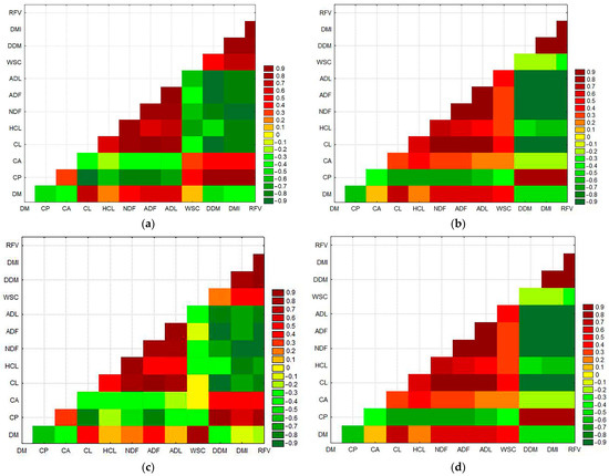 The RFV (dimensionless quantity) was calculated using the estimates of digestible dry matter (DDM%) and potential dry matter intake (DMI% of body weight) of the forage, based on the ADF and the NDF fractions, respectively, using the formulas [42]: