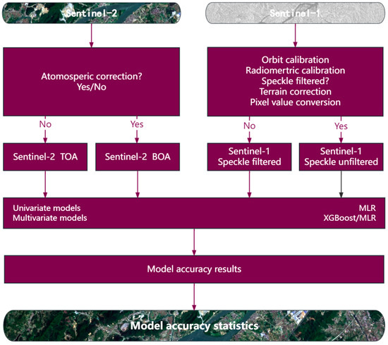 Eventually, 16 feature sets were established to investigate different combinations of S1 and S2 data on the basis of different preprocessing techniques. In the same measure, XGBoost and MLR were both used for modeling the forest AGB of four classes of plots. Figure 2 shows an overview of the steps taken for forest AGB prediction, while Table 4 lists the details of the 16 feature sets.