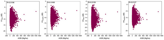 Figure 3 illustrates the relationships between all of the plots, the speckle-filtered images, and the unfiltered images from S1 SAR. All of the relationships between the two parameters were nearly zero, which shows a weak association between forest AGB and S1 dual polarization. Furthermore, the difference between the speckle-filtered and unfiltered images was also rather close to zero. Figure 4 portrays the distribution of the S1 VV polarization using different preprocessing methods. The distribution between the speckle-filtered and unfiltered S1 VV imagery was almost in superposition.