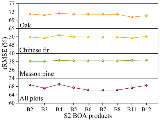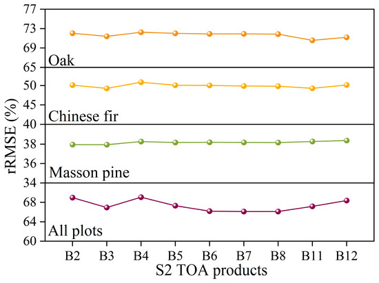 Figure 5 exhibits the performance of the S2 spectral bands derived from the studied imagery, with or without atmospheric correction. In the comparisons of the performances using the two kinds of S2 products, the accuracies we reached were pretty close. For oak, Chinese fir, Masson pine, and all of the plots, the highest accuracies in TOA were acquired, respectively, by B11 (rRMSE = 70.57%); B3 (rRMSE = 49.25%); B2 and B3 (rRMSE = 37.95%); and B7 and B8 (rRMSE = 66.09%), while the worst performances were demonstrated by B4 (rRMSE = 72.25%); B4 (rRMSE = 50.86%); B12 (rRMSE = 38.37%); and B4 (rRMSE = 69.04%), respectively. In contrast, the best-performing variables in the BOA products were, respectively, B11 (rRMSE = 70.55%); B3 (rRMSE = 49.26%); B2 and B3 (rRMSE = 38.06%); and B7 (rRMSE = 66.27%), while the worst were B4 (rRMSE = 72.31%); B4 (rRMSE = 50.93%); B12 (rRMSE = 38.37%); and B4 (rRMSE = 69.05%).