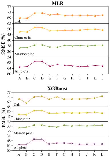 The predicted rRMSE (%) of the forest AGB for several kinds of plots using multivariate models implementing 12 groups of feature sets. The letters A–L represent the groups A–L as listed in Table 4.