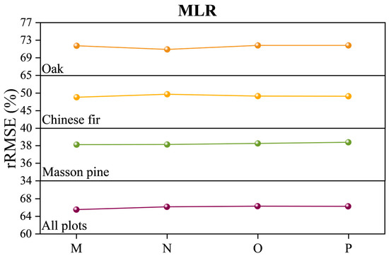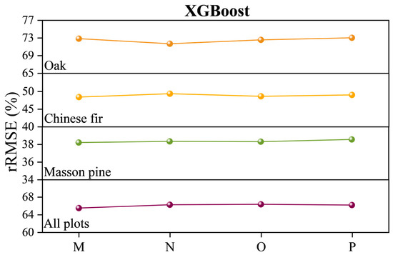 The predicted rRMSE (%) of the forest AGB for several kinds of plots using multivariate models implementing 12 groups of feature sets. The letters M–P represent the groups M–P as listed in Table 4.