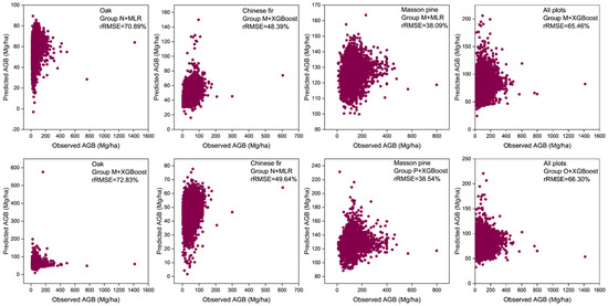 The scatterplots of the observed and the predicted AGB. The kinds of plots and the experimental groups are displayed in the upper right corner. Among groups M–P, the first row shows the worst-performing models, while the second row shows the best-performing models.