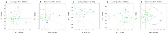 Principal Components 1 and 2 reflected 82.03% and 14.79% of the total variance, respectively (Figure 1e and Figure 2e). Both principal components reflected 96.85% of the genotype effect and the G × site interaction effect. Family 21 had the best overall performance in terms of the tree height, DBH, individual plant V, and HCB (Figure 1e). Four families (10, 14, 20, and 21) had excellent and stable comprehensive performances (Figure 2e), whereas the remaining 27 families had poor growth and morphological performances overall. The average genetic gains for their growth traits—tree height (H), diameter at breast height (DBH), and volume (V)—and morphological traits—height to live crown base (HCB)—were 21.29%, 22.92%, 21.25%, and −0.14%, respectively (Table 12).