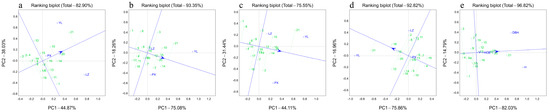 Mean vs. stability GGE biplot based on the single traits and comprehensive traits at the three sites. (a) Biplot analysis based on the height BLUP. (b) Biplot analysis based on the DBH BLUP. (c) Biplot analysis based on the V. (d) Biplot analysis based on the HCB BLUP. (e) Biplot analysis based on the all-traits BLUP. LZ, YL, and PX indicate the three sites used for the C. hystrix family trials. Letters followed by numbers indicate the number of families. The blue lines with an arrow represented the mean environmental axis. The green vertical dotted lines represent the average yield and stability of each family in all experimental sites.