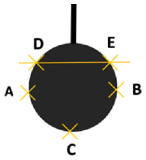 The wettability of an adhesive includes the surface tension and contact angle. The surface tension of the LMUF resin was measured using the hanging drop method: The picture of the MUF hanging drop was taken with the JC2000A dropping contact angle measuring instrument. Three points on the left (A), right (B) and bottom (C) of the hanging drop were selected, and a horizontal line (DE) would appear at the top of the hanging drop intersecting both sides. The information on intersections D and E could then be read (Figure 2), and the surface tension was calculated with reference to the literature.