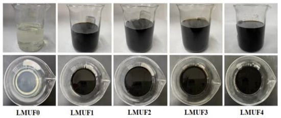 The appearance and basic performance of the MUF resins are shown in Figure 3 and Table 2. It can be seen from Table 2 that the viscosity of the unmodified MUF resin was 68.4 mPa·s. The viscosity of the LMUF modified with 2%, 4%, 6% and 8% of hydroxymethyl lignin was 88.6, 107.9, 232.6 and 412.4 mPa·s, respectively. The viscosity improved for the following reasons: (1) Lignin might contain some impurities that don’t participate in synthetic reactions. For example, the viscosity of the resin system might be increased when vegetable glue encounters water. (2) Due to its high molecular weight, lignin has an electrostatic force and hydrogen bond association with them [20]. (3) The benzene rings on lignin molecules are hydrophobic, and the affinity of lignin molecules for water is low, thus resulting in the high viscosity of the modified MUF resin. (4) Hydroxymethyl lignin participates in a polycondensation reaction with the MUF resin to produce polymers with a higher molecular weight. (5) Hydroxymethyl lignin and hydroxymethyl melamine molecules form “groups” through hydrogen-bond interactions to increase viscosity. In a word, the viscosity of the MUF resin increased continuously over the extension of the reaction time due to the above five factors, which surely influenced the pot life of the adhesives. The pot life of the unmodified MUF resin reached as long as 90 days, but the pot life of the MUF resins modified with 2%, 4%, 6% and 8% of hydroxymethyl lignin decreased to 41, 36, 23 and 19 days. Nevertheless, the pot life of the modified MUF resin could still meet the production requirements, with a minimum application period of nearly 20 days.