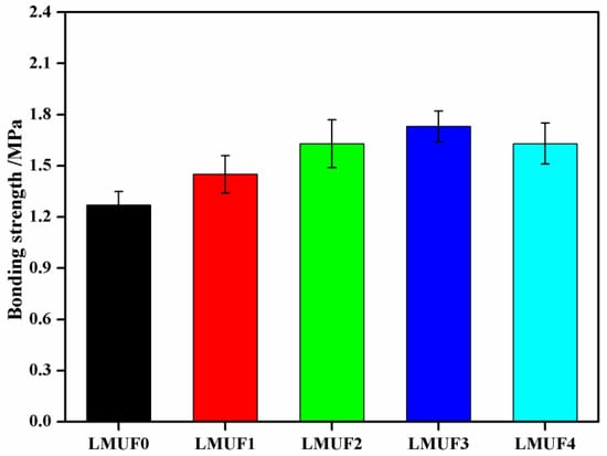 As shown in Figure 4, the bonding strength of the control MUF resin was 1.27 MPa, and that of the LMUF modified with 2%, 4%, 6% and 8% of hydroxymethyl lignin increased to 1.45, 1.63, 1.73 and 1.63 MPa, respectively. With the increase in hydroxymethyl lignin content, the bonding strength increased first and then decreased, but the bonding strength of the MUF resin modified by different amounts of hydroxymethyl lignin increased to different extents. The bonding strength reached the maximum (1.73 MPa), and it increased by 36% at 8% of hydroxymethyl lignin content. An appropriate amount of hydroxymethyl lignin could realize the graft copolymerization effect. It participated in the condensation reaction of the MUF resin and increased the degree of cross–linking of the resin, thus increasing the bonding strength. In addition, the wood failure percentage of all the samples was above 60%, and the variation trend of the wood failure percentage was consistent with that of the bonding strength, which showed that the bonding reliability of the modified MUF resin was improved. However, excessive hydroxymethyl lignin was disadvantageous for improvement of the bonding strength, because (1) the active sites on the benzene rings of the lignin, which had not been replaced, still reacted with the formaldehyde, and the excessive content of hydroxymethyl lignin consumed more formaldehyde from the system, thus influencing the urea–formaldehyde and melamine–formaldehyde reactions, affecting the degree of cross–linking of the resin system, and thereby influencing the bonding strength of the resin; (2) lignin has a complicated structure and abundant active groups are wrapped in molecules. The substituent groups on the aromatic ring had great steric hindrance and relatively low chemical reaction activity. Hence, excessive lignin hindered the normal polymerization of melamine, urea and formaldehyde. (3) Adhesives must have some wettability and diffusivity on the wood surface for bonding to form a thin and uniform glue layer and form enough bonding points to the wood, thus creating the essential conditions to realize good bonding performance [60,61,62]. However, the modified MUF resin had high viscosity, thus increasing the cohesion, but weakening the wettability. Additionally, high viscosity might also influence the operational performance of the MUF resin.
