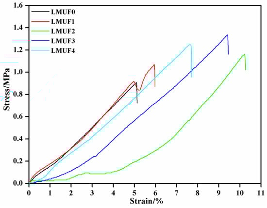 The stress–strain curves of the resins are shown in Figure 5. The MUF resin molecules after curing had short lattice chains, high cross–linking density, great steric hindrance, difficult bending of the molecular chain against external stress–strain, great brittleness of the curing layer and a decreased ability to absorb impact energy [20,25]. The triazine ring in the melamine molecule is a kind of heterocyclic ring with a similar structure to an aromatic ring. Due to the great steric hindrance and high rigidity of the triazine ring, the MUF resin has poor flexibility. In addition, there were hydroxymethyls that did not participate in the reaction in the curing of the MUF resin, which added hygroscopicity and generated stresses and fatigue due to frequent moisture absorption and desorption, finally developing brittleness [49]. Hence, the unmodified cured MUF resin had high strength and brittleness. In the tensile test, cracks developed inside before the stress reached the yield limit, and the samples were broken, although there was no obvious yield on the stress–strain curve, and the elongation at the break was only 5.1%.
