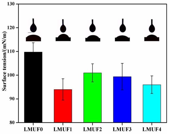 There are more sparse molecules on the liquid–gas interface than in the internal structure. With the increase in intermolecular distance, molecules attract mutually, and the surface molecules bear inward tensile stresses [61,62]. Hence, there is an automatic shrinking trend on the liquid surface, which is manifested as surface tension. The unmodified MUF resin system contained a lot of hydroxymethyl melamine and methylol urea. The aggregation of these hydroxymethyls easily causes the aggregation of hydrogen bonds, thus resulting in a high surface tension of 109.8 mN/m. The surface tension on the MUF modified with 2%, 4%, 6% and 8% of hydroxymethyl lignin decreased to 94.0, 101.1, 99.4 and 96.0 mN/m (Figure 6). This was because the hydroxymethyl lignin could result in polycondensation with the hydroxymethyls, thus decreasing the hydroxymethyl content and weakening the acting force of the hydrogen bonds. As a result, the surface tension decreased, which also reflected indirectly that the hydroxymethyl lignin participated in the synthesis reaction of the MUF resin.