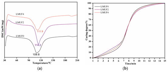 The curing degree is an important index to measure the curing reaction of adhesives. The curing degree curve of different MUF resins can be obtained (Figure 7b) by integrating the DSC peaks in Figure 7a. The curing degree curves of LMUF0, LMUF2 and LMUF4 had an intersection at 65%. With respect to the curing reaction rate, LMUF0 < LMUF4 < LMUF2 below 65%, and LMUF2 < LMUF4 < LMUF0 over 65%. Hence, the introduction of hydroxymethyl lignin could facilitate the curing of MUF resins in the early stage, because it increased the active hydroxymethyl contents in the system. However, such a promotion effect was not obvious in the late stage, because the reaction activity of hydroxymethyl lignin was weaker than those of methylol urea and hydroxymethyl melamine. The curing peak temperature of the unmodified MUF resin was 109.8 °C, and the curing peak temperatures of LMUF2 and LMUF4 were 114.2 °C and 111.9 °C, respectively. Hence, the introduction of hydroxymethyl lignin generally increased the curing temperature of the resins.