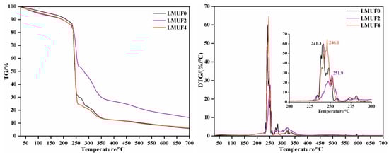 The TG/DTG curves of the cured products of the MUF resins are shown in Figure 8. All the TG/DTG curves generally showed the same trend. Stage 1: 35–150 °C—this stage mainly had steam evaporation and the decomposition of micromolecular and unstable chemical bonds. There was a relatively low loss of mass in this stage. Stage 2: 150–400 °C—this was a stage of thermal decomposition of the major skeleton of the MUF resins, involving the breakage and decomposition of ether bonds, the release of formaldehyde, and the breakage and decomposition of polymethylene bonds [49,50,51]. The oxygen–containing groups were broken down and formed amorphous carbon at this stage. LMUF2 had a low mass loss ratio in this stage. LMUF0 and LMUF2 achieved the maximum weight loss ratios at 241.3 and 251.9 °C. This reflected that MUF resins modified with hydroxymethyl lignin produced stable cross-linking products. LMUF4 achieved the maximum weight loss ratio at 246.1 °C, indicating that excessive hydroxymethyl lignin affected the thermostability of the resin. Hence, the cross-linking network structure formed after the polycondensation reaction of the MUF resins became more compact and stable by adding an appropriate amount of hydroxymethyl lignin.