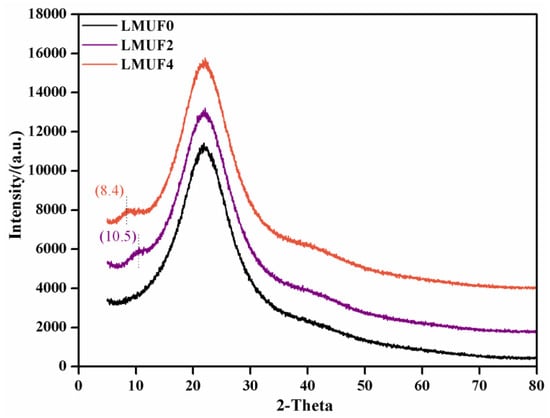 It can be seen from Figure 9 that the unmodified MUF resin had a relatively sharp absorption peak and a high diffraction intensity at 002, without the diffraction peaks of other impurity phases, and the resin presented high rigidity. The MUF modified with 2% and 6% hydroxymethyl lignin developed new absorption peaks at 2θ = 10.5° and 8.4°, which were peaks formed by polycondensation between the hydroxymethyl lignin and the MUF. The different positions of the peaks also reflected different degrees of polycondensation of the final product indirectly. The appearance of new peaks indicated that the resin structure became more disordered, and the rigidity was weakened. In other words, the flexibility was enhanced.