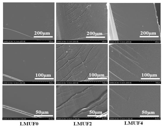 It can be seen from Figure 10 that the unmodified MUF resin had smooth and flat sections, indicating a brittle fracture. The fracture surfaces of the LMUF had obvious wrinkle and waveform structures, which were attributed to the absorption of abundant energy and fracture yield during the breakage of resins, which is a typical characteristic of flexibility failure. Although the MUF resin modified with 8% hydroxymethyl lignin (LMUF4) still showed flexibility failure features, the wrinkle and waveform textures decreased obviously. Theoretically, adding hydroxymethyl lignin, which is a kind of flexible long–chain molecule, into triazine rings could give the resin a greater ability of intramolecular deformability and gradual strengthening of flexibility. In fact, there was no proportional relationship between the hydroxymethyl lignin content and flexibility, because the excessive hydroxymethyl lignin influenced the polycondensation reaction.