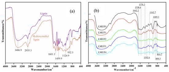 The FTIR curves before and after the hydroxymethylation of the lignin are shown in Figure 11a. As a kind of natural macromolecular compound with a very complicated chemical structure, lignin is composed of three structural units, including syringyl, guaiacyl propane and phydroxyphenyl propane. Figure 11 shows the stretching vibration absorption peak of O–H at 3406.9 cm−1, the stretching vibration absorption peak of C–H in the methylene of lignin at 2935.3 cm−1, the skeleton vibration peak of the benzene ring, the feature band of the lignin at 1601.3 cm−1, the C–H stretching vibration of the methoxy group on the benzene ring of the lignin at 1459.9 cm−1, and the deformation vibration absorption peak of C–H on the phenylpropane aromatic ring of the lignin at 1124.9 cm−1 [20]. The peaks at 1046.1 and 980.5 cm−1 are the aromatic C–H series.