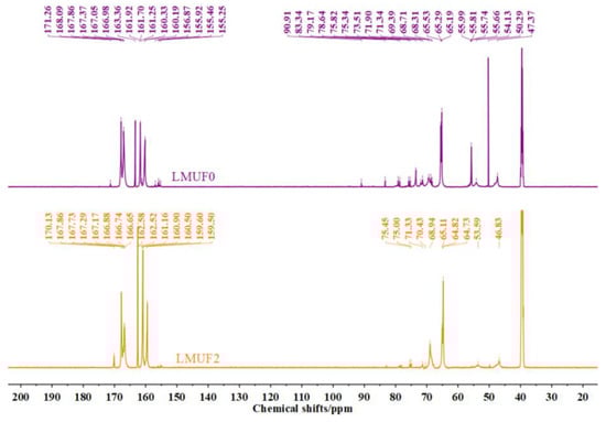 Quantities of 100 µL of LMUF resin and 300 µL of DMSO–d6 were injected into a nuclear magnetic tube, dissolved and shaken, and tested by a Bruker Avance high–resolution superconducting over frequency nuclear magnetic resonance instrument. The test parameters were as follows: pulse sequence, zgig; internal standard, DMSO–d6; cumulative times, 500–800 times; spectral width, 39,062.5 Hz.