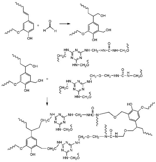 The inclusion of natural macromolecular compounds into the building of a co-condensed resin system can improve the environmentally friendly performance of adhesives and decrease dependence on fossil resources [48,49]. Hence, biomass–based co-condensation technology attracts more and more attention. Mixing biomass materials like soybean proteins, polysaccharides, tannin and lignin with MUF, or establishing biomass-based co-condensed resin by using biomass materials and MUF, can achieve the ideal modification effect. Both methods can not only improve the bonding strength and water resistance of MUF resin but also have lower costs and free formaldehyde [50,51,52,53,54,55,56].