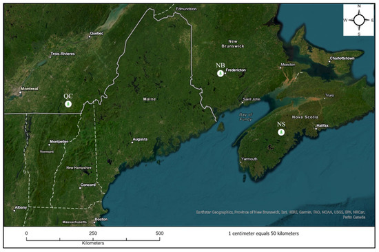 Three areas were selected for this study: a provincial clone bank in Kingsclear, NB, Canada (45°57′31.5″ N 66°48′07.2″ W); a multi-aged natural Christmas tree stand (seed production area) in New Germany, NS, Canada (44°33′48.5″ N 64°45′09.5″ W); and a Christmas tree plantation in Hatley, QC, Canada (45°14′05.6″ N 71°56′13.5″ W) (Figure 1).