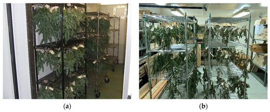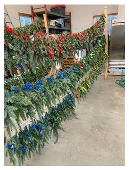 Downey test site: In Quebec, the branches were tagged and hung in a garage/shop. There was limited temperature control and no formal humidity control at this location, but this is where their routine needle retention testing is carried out (Figure 4). Conditions in this building are generally stable at around 20 °C to 22 °C and relative humidity of approximately 60% [27]. No supplemental light was provided to the branches, and all tests ran for six weeks.