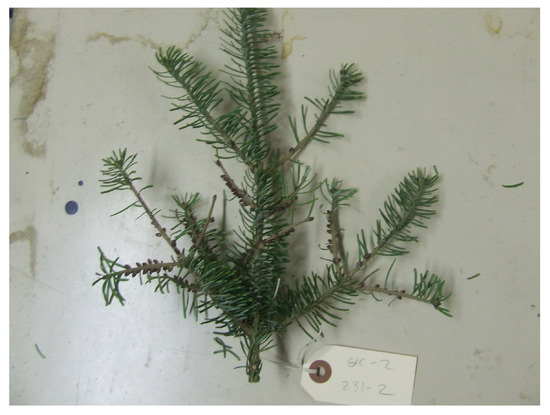 Not all branches from single trees exhibited the same needle retention pattern, possibly because of the slight differences in the presence or absence of pollen buds, and the aspect and position within the crowns. All the tested branches had two years of growth and were collected from the upper crowns of the trees. This was implemented so that the age classes of needles were the same for all branches. Needle drop and replacement naturally occur in trees and increase as needles age. Balsam fir needles that are one and two years old will experience a needle drop of less than 10 percent, but this percentage increases yearly thereafter [32].