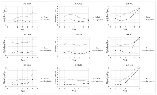 The pattern of needle loss differed among the three years of testing. In 2020 and 2022, the mean needle loss increased over time. In 2021, the mean needle loss did not increase in weeks four and five to the same degree as in 2020 and 2022. Within any year, the overall pattern of needle loss was generally the same for all provinces and both the early and late collection series (data on file). Needle loss for the ‘Select’ trees compared with the ‘Population’ group by year and province is shown in Figure 6.