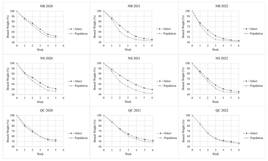 All branches were weighed weekly until they were discarded. When testing moisture loss slope coefficients within the two groups of trees, comparisons between the early and late collections were statistically significant for some but not all test series (Table 7). ‘Select’ trees from Nova Scotia and Quebec lost moisture at a significantly slower rate than the corresponding ‘Population’ trees (Figure 7, Table 8). For New Brunswick trees, the differences were significant for 2021 but not in 2020 and 2022. The difference in the percent weight loss between the ‘Select’ and ‘Population’ trees was the smallest for Quebec branches but still statistically significant (Figure 7, Table 8).