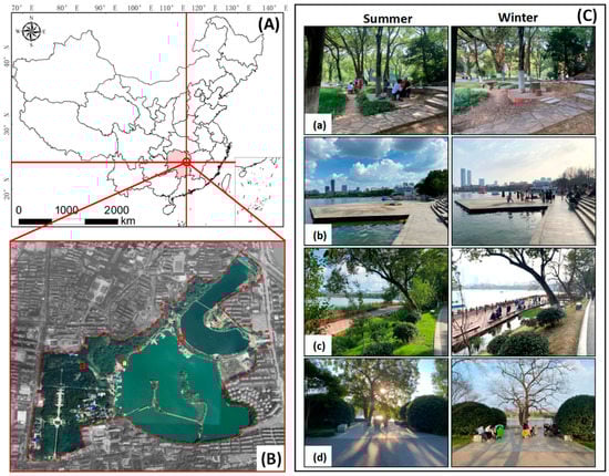 Location of the study area (A), map of the Hunan Martyr Park (B), and photos of four representative activity zones in summer and winter (C).