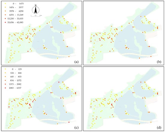 Visitation density showed strong spatiotemporal variation in the Hunan Martyr Park. The average summer daytime visitation density was 4388 people per ha (p/ha), ranging from 15 to 62,083 p/ha with a standard deviation of 7641 p/ha. The average winter daytime visitation density was 5902 p/ha, ranging from 0 to 83,333 p/ha, with a standard deviation of 10,037 p/ha. The average summer nighttime visitation density was 758 p/ha, ranging from 0 to 17,083 p/ha, with a standard deviation of 1808 p/ha. The average winter nighttime visitation density was 410 p/ha, ranging from 0 to 6337 p/ha, with a standard deviation of 763 p/ha (Table 3). Figure 2 shows the spatial pattern of visitation density in different periods. The visitation densities are randomly distributed with insignificant and low values of Moran’s I (Table 3).