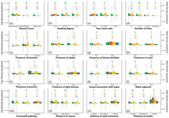 Kruskal–Wallis H-test (K samples) multiple comparisons analysis of visitation density during four time periods (n = 109), respectively. Green indicates summer daytime, red indicates summer nighttime, yellow indicates winter daytime, and blue indicates winter nighttime. Different letters indicate significant differences (p < 0.05). (a) indicates ground cover, (b) indicates shading degree, (c) indicates tree cover ratio, (d) indicates number of trees, (e) indicates presence of benches, (f) indicates presence of tables, (g) indicates presence of fitness facilities, (h) indicates presence of court, (i) presence of pavilion, (j) indicates presence of light devices, (k) indicates visual connection with water, (l) indicates water adjacent, (m) indicates connected pathway, (n) indicates distance to stores, (o) indicates distance to park entrances, (p) indicates distance to toilets.