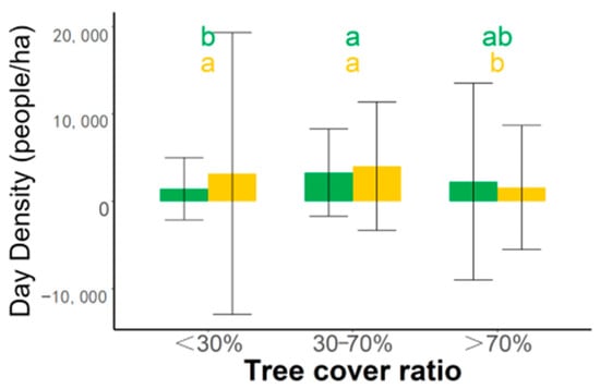 Zones with paved surfaces had significantly higher visitation density than zones covered by grass and bare land in all periods (Table 4 and Figure 3a). Visitation density in zones with a shading degree higher than 0.7 was significantly higher than that in zones with a shading degree lower than 0.3 in summer daytime, but there was no significant difference in winter daytime. Significantly higher visitation density was observed for activity zones with a tree cover ratio of less than 30% in winter daytime, but significantly higher visitation density was not observed for activity zones with a tree cover ratio high than 70% in summer daytime. During the nighttime in both seasons, significantly higher visitation density was observed for activity zones with a shading degree and a tree cover ratio of less than 30% (Table 4 and Figure 3b,c).
