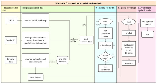 Among machine learning algorithms, ensemble learning algorithms can combine multiple classifiers together to improve the accuracy and generalization ability of classifiers. Overall, based on the presence or absence of dependencies between base classifiers, ensemble learning algorithms are divided into two types: boosting and bagging. Boosting algorithms have a strong dependency between base classifiers, and a series of base classifiers needs to be generated serially, represented by AdaBoost and GBDT. In fact, GBDT is more suitable for multi-category classification, and LightGBM and CatBoost are two important improved algorithms based on GBDT. In contrast, bagging algorithms do not have a strong dependency between base classifiers, and a series of base classifiers can be generated in parallel, represented by Random Forest. Regarding the research data, Wang Daling et al. evaluated the forest ecological function of arboreal forests based on the data of subcompartments from the 2018 forest resources planning and design survey of the Sanchazi Forestry Bureau [12]. Jun Yang et al. conducted a qualitative analysis of the health and ecological status of Chinese forests in 2009 based on the data of the seventh national forest resource inventory [13]. Liu Lixia et al. evaluated the ecological functions of forests based on the data of the forest resources planning and design survey [14]. Zhang Xianwu et al. used the results of the three continuous forest inventories from 2004, 2009, and 2014 to analyze the current situation, changes, and reasons of changes in the comprehensive index of forest ecological functions in Shanghai using nine indicators including forest stock, forest naturalness, and proportion of forest land area to national land area [15]. Even though forest resource inventory data has high accuracy, there are still issues of high cost and difficulty in data acquisition. Forest managers, decision makers, and politicians need to be able to make data-driven rapid decisions based on short-term and long-term monitoring information, complex modeling, and analysis approaches [11]. Thus, researchers are increasingly considering incorporating lower-cost data such as remote-sensing images and lower-cost strategies into our study.