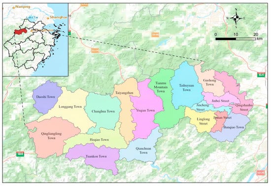 Lin’an District (118°51′~119°52′ E, 29°56′~30°23′ N) is located in the northwest of Zhejiang Province, with a total area of 3126.8 square kilometers, shown in Figure 2. It is in the central subtropical monsoon climate zone, rich in plant resources. As a typical southern forest city, the forestry land area of Lin’an is up to 263,868.79 hm2, with 1603.88 hm3 of forest standing stock and 81.99% of forest canopy density.