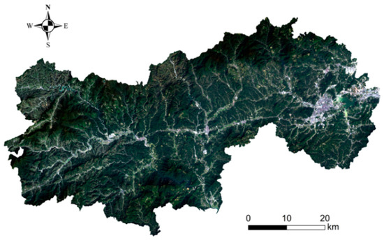 For the Sentinel-2 remote sensing images, Sen2Cor® (v2.8, European Space Agency, Paris, France) was used for atmospheric correction, and SNAP® (v6.0, European Space Agency, Paris, France) was exploited to resample the bands (band1, band5, band6, band7, band8A, band9, band10, band11, and band12) to fuse the lower-resolution images of 20 m and 60 m with higher-resolution images of 10 m by the nearest neighbor method. After that, by the operations of image mosaic and clipping in ArcGIS® (v10.8, Environmental Systems Research Institute, Inc., Redlands, CA, USA), a valid and complete remote sensing image of the Lin’an District (Figure 3) was produced.