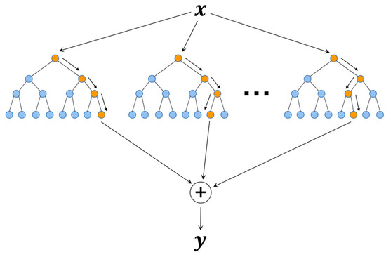 Random forest [26,27] is a collection of multiple decision tree algorithms with random sampling, which is a combination of Breiman’s “bagging” idea and a random selection of features. The procedure consists in making a precise prediction by taking the average or mode of the output of multiple decision trees (shown in Figure 6). Typically, the greater the decision trees’ number, the more precise the output and the greater the overhead. In our study, to balance accuracy and overhead, the default number of decision trees was set to 100, and the parameter range of the grid search was set to 100–500 with a step size of 5. The final experimental results showed that when the number of subtrees reached 200, the increase in the number of subtrees had a minimal effect on the model enhancement. Therefore, the optimal parameter value was finally set to 200. Also, the maximum number of features was set to 195, which was the square root of the number of training samples (47,596 * 0.8).