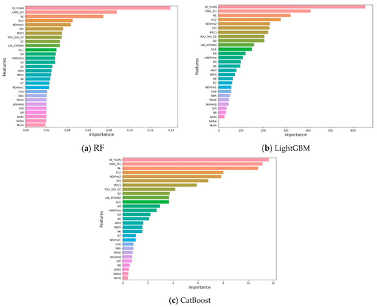 Ranking the importance of the features based on the multi-source data scheme D. (a) Ranking the importance of the features by RF; (b) ranking the importance of the features by LightGBM; (c) ranking the importance of the features by CatBoost.