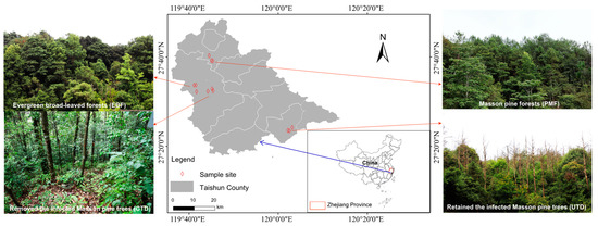 The study sites are located in Taishun County (27°17′–27°50′, 119°37′–120°15′) in Zhejiang Province, China (Figure 1). This region has a humid, subtropical monsoon climate. The mean annual temperature is 16 °C, and the mean annual precipitation is 2000 mm. Taishun County has had high rates of PWD infestation in the last five years. The first record of PWD occurrence in Taishun County was in Yayang Town in 2016. The total land area of Taishun County is 1761.5 km2, of which the forest cover is 76.9%. According to unpublished data from the local forestry department, the PWD census in the autumn of 2020 showed an epidemic area of about 19 km2, with 218,708 dead pine trees in the county.